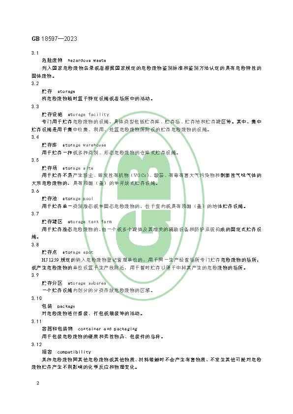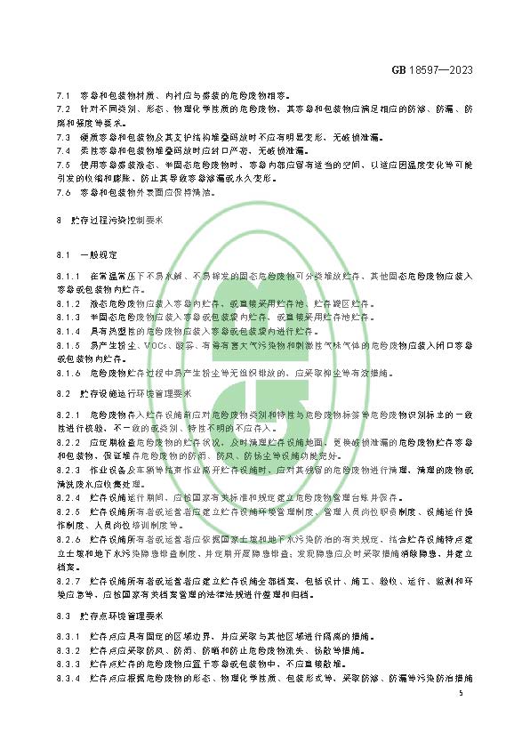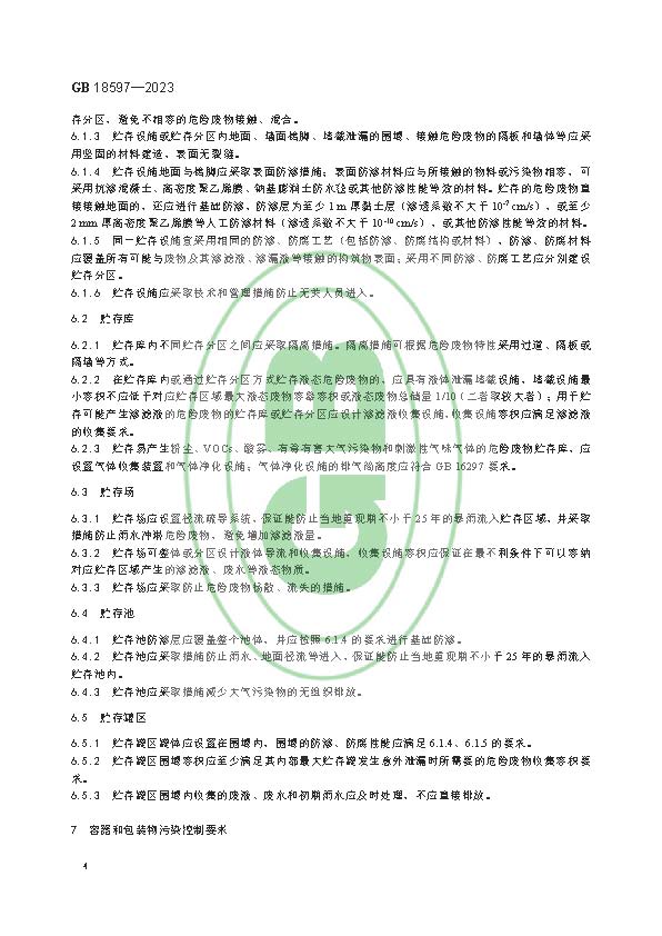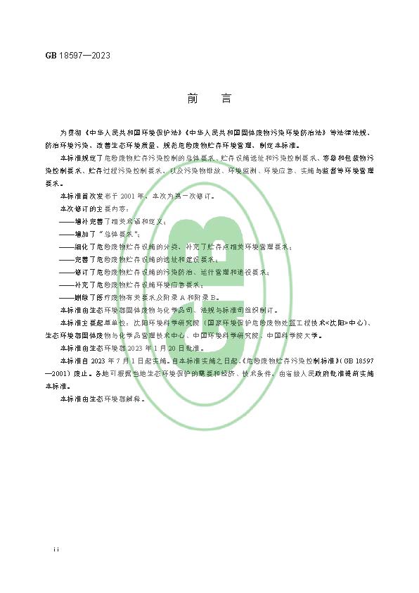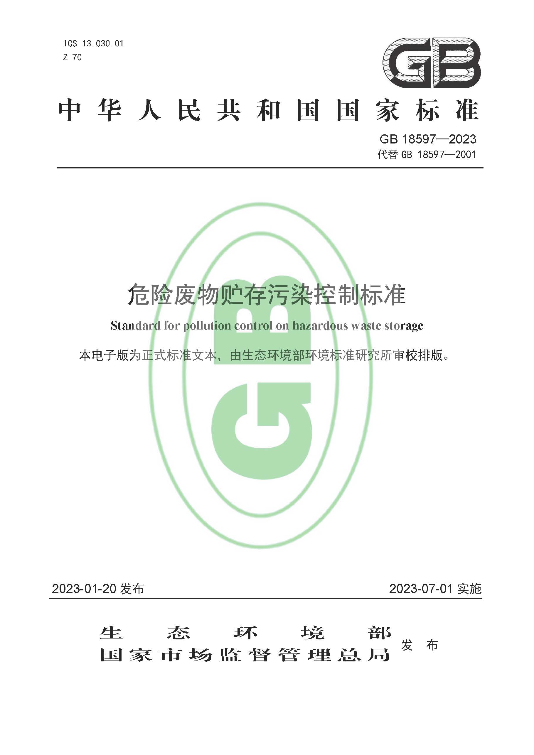 為貫徹《中華人民共和國(guó)環(huán)境保護(hù)法》《中華人民共和國(guó)固體廢物污染環(huán)境防治法》等法律法規(guī),防治環(huán)境污染,改善生態(tài)環(huán)境質(zhì)量,規(guī)范危險(xiǎn)廢物貯存環(huán)境管理,制定本標(biāo)準(zhǔn)。本標(biāo)準(zhǔn)規(guī)定了危險(xiǎn)廢物貯存污染控制的總體要求、貯存設(shè)施選址和污染控制要求、容器和包裝物污染控制要求、貯存過(guò)程污染控制要求,以及污染物排放、環(huán)境監(jiān)測(cè)、環(huán)境應(yīng)急、實(shí)施與監(jiān)督等環(huán)境管理 要求。本標(biāo)準(zhǔn)首次發(fā)布于2001 年,本次為第一次修訂。本標(biāo)準(zhǔn)由生態(tài)環(huán)境部固體廢物與化學(xué)品司、法規(guī)與標(biāo)準(zhǔn)司組織制訂。本標(biāo)準(zhǔn)由生態(tài)環(huán)境部2023 年1 月20 日批準(zhǔn)。本標(biāo)準(zhǔn)自2023 年7 月1 日起實(shí)施。自本標(biāo)準(zhǔn)實(shí)施之日起,《危險(xiǎn)廢物貯存污染控制標(biāo)準(zhǔn)》(GB 18597—2001)廢止。