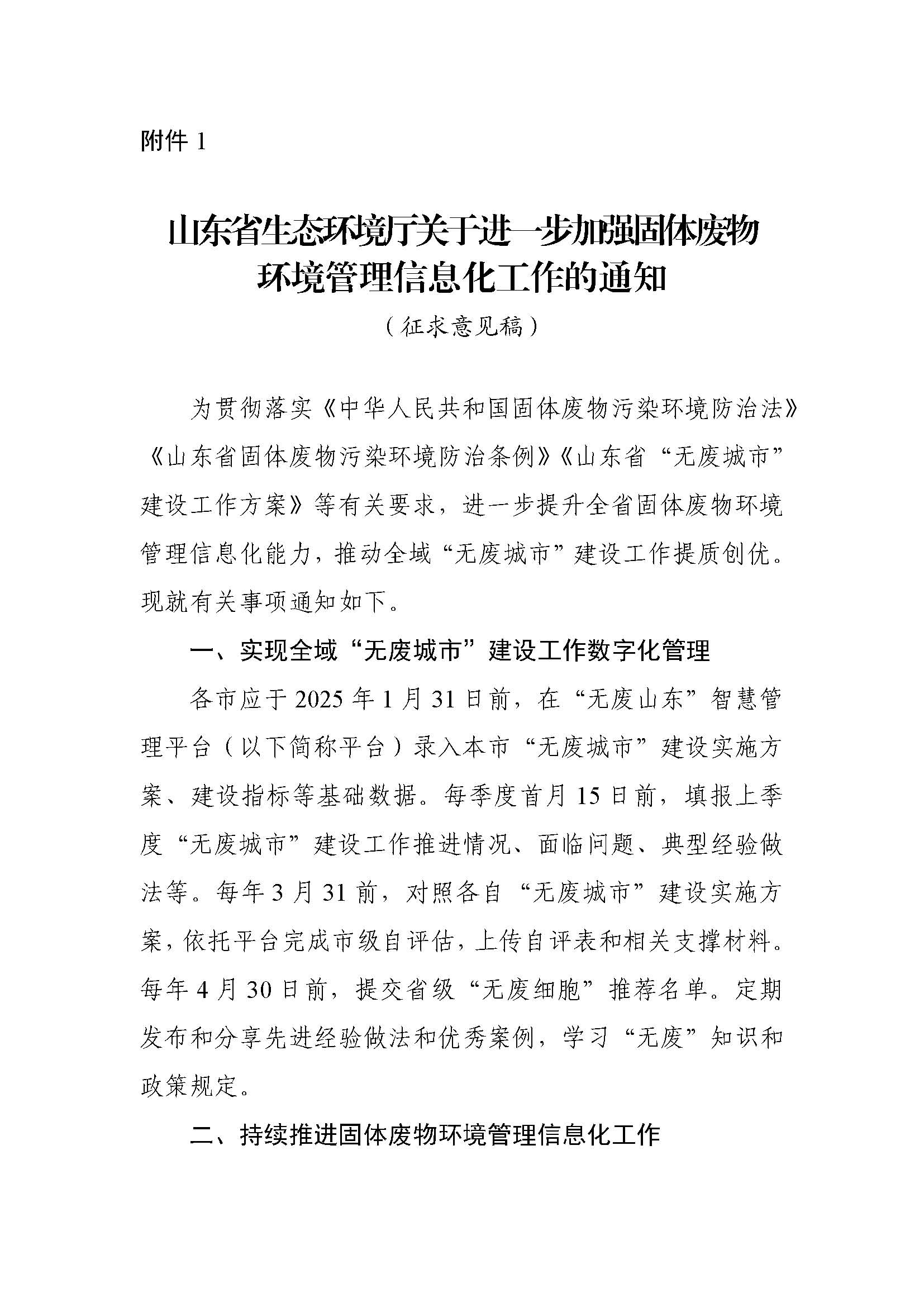 為貫徹落實《中華人民共和國固體廢物污染環(huán)境防治法》《山東省固體廢物污染環(huán)境防治條例》《山東省“無廢城市”建設(shè)工作方案》等有關(guān)要求,進(jìn)一步提升全省固體廢物環(huán)境管理信息化能力,推動全域“無廢城市”建設(shè)工作,我廳組織起草了《關(guān)于進(jìn)一步加強(qiáng)固體廢物環(huán)境管理信息化工作的通知(征求意見稿)》,現(xiàn)公開征求意見,有關(guān)意見請于2024年12月27日前反饋至聯(lián)系人郵箱。